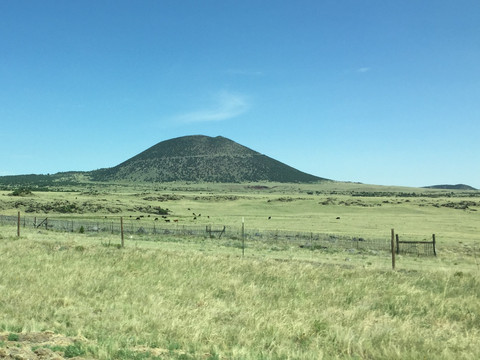 The drive through New Mexico took us through an enchanted landscape with a high desert and plateaus surrounded by barren mountains. On we went through grassy plains where you could see for many kilometers to the horizon with sparse grass, interrupted by low bushes, pines growing close to the Ground.